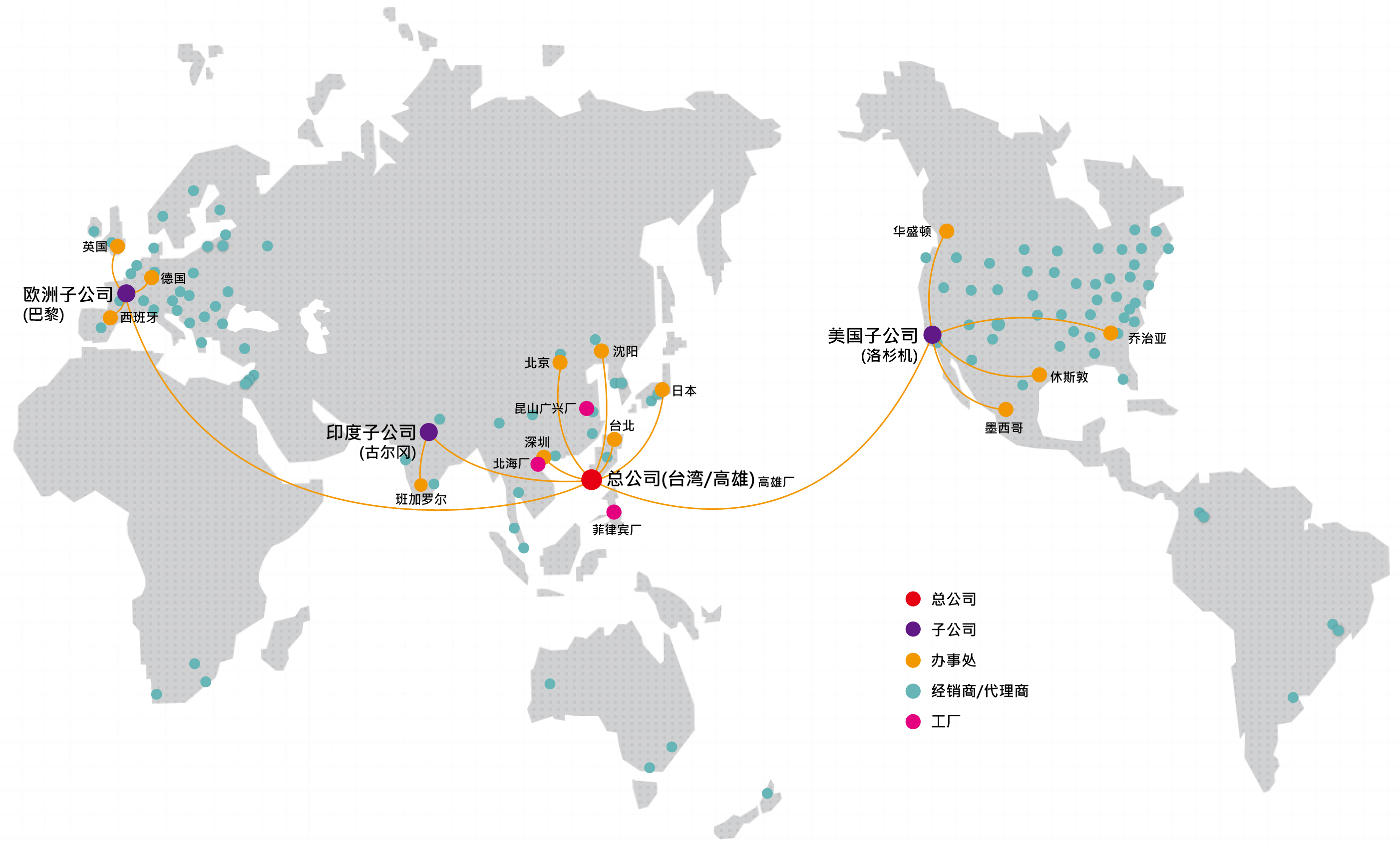 建准集团企业营运总部设立于台湾高雄,结合欧洲、美国、印度等地区的子公司与办事处,全球超过120个经销代理商,及1,000余个销售服务据点,构成一个范围广达全球五大洲的客户服务与技术支持网络,能够实时和迅速响应客户的需求。